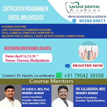 Saisha® dental academy is an initiative by likeminded leading researchers and dental professionals seeking a forum where they could share their ideas and experiences to further advance dental care. The forum started bringing in the best practises in Global dentistry, to provide the BDS students, and other dental professionals with the art of the state technology in dentistry. The India's dental care market was valued at $653 Mn in 2022 and is estimated to expand at a compound annual growth rate (CAGR) of 9.40% from 2022 to 2030 and will reach $1339 Mn in 2030.